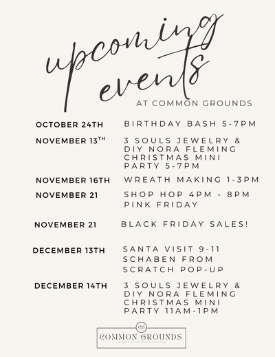 At Common Grounds, we offer Event Rentals, Hat Bar, Charm Bar, Cup Bar, T+Shirt Bar, Nora Fleming, and multiple events each month! Follow us on social media for dates and more!