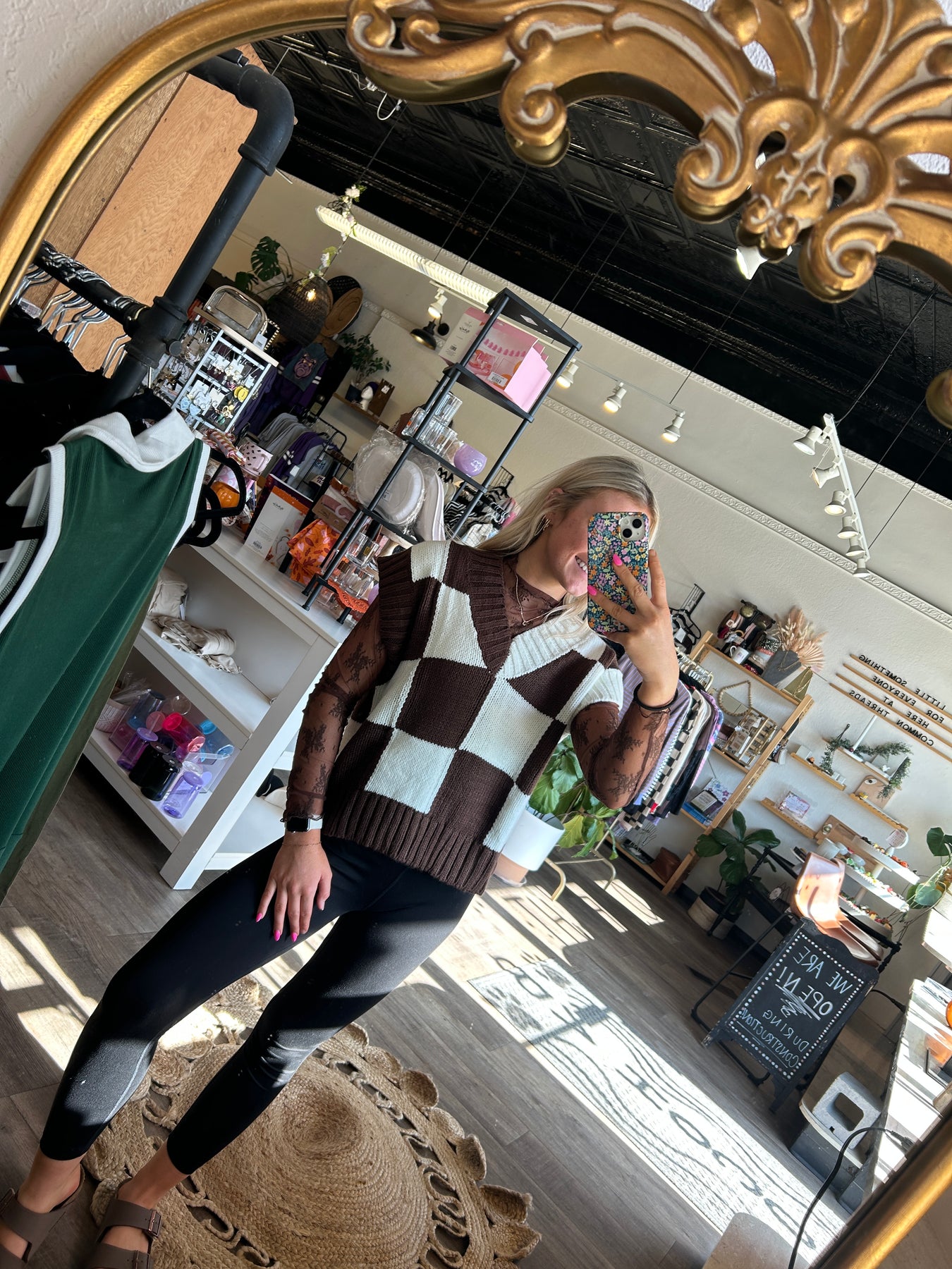 Bring a fun twist to your wardrobe with the Checks All the Boxes Vest! Featuring a charming brown and white checkered pattern, this cozy sweater vest is perfect for layering over your favorite shirts. It adds a playful pop to any outfit while keeping you comfy and stylish all day long. Whether you're dressing up or down, this vest is sure to check all the boxes for effortless charm!