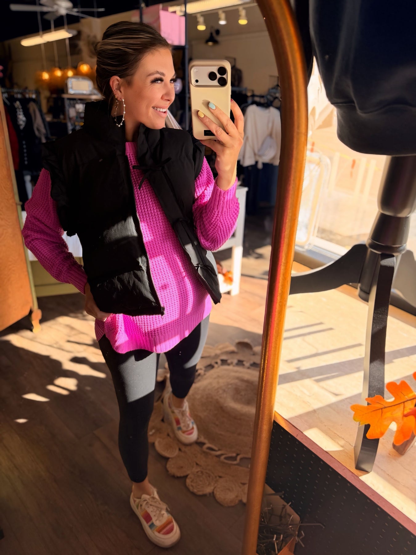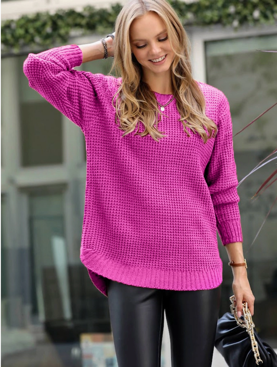 Stay cozy and bold in the Fierce Fuchsia Sweater! This midweight waffle-knit long sleeve features a comfy round neck design, perfect for layering or wearing solo. Its vibrant fuchsia hue adds a playful pop to any outfit!