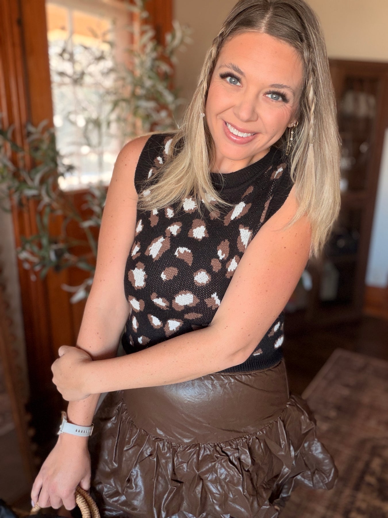 Embrace effortless style with this sleeveless leopard jacquard sweater tank. Crafted from a luxurious blend of viscose, polyester, and nylon, this piece delivers softness and durability in one versatile design. The classic round neckline and animal print pattern make it a go-to essential for layering or wearing solo. Perfect for spring and beyond, this trending top transitions seamlessly from casual to polished looks.