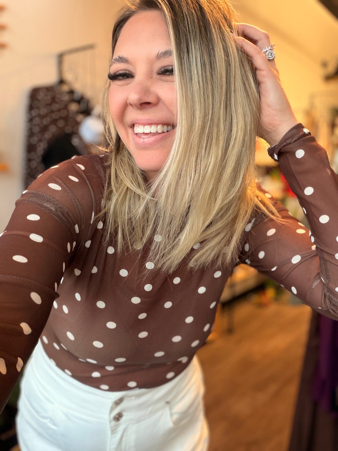 Embrace your playful side in this charming polka dot mesh top! Featuring a timeless dot pattern on sheer fabric, it offers a breezy, effortless vibe perfect for layering or wearing solo. The flexible fit moves with you, while long sleeves and a classic round neckline keep things versatile. Shirring at the hem adds subtle definition without compromising comfort. Unlined for that light, airy feel—ideal for warm weather styling with endless possibilities.