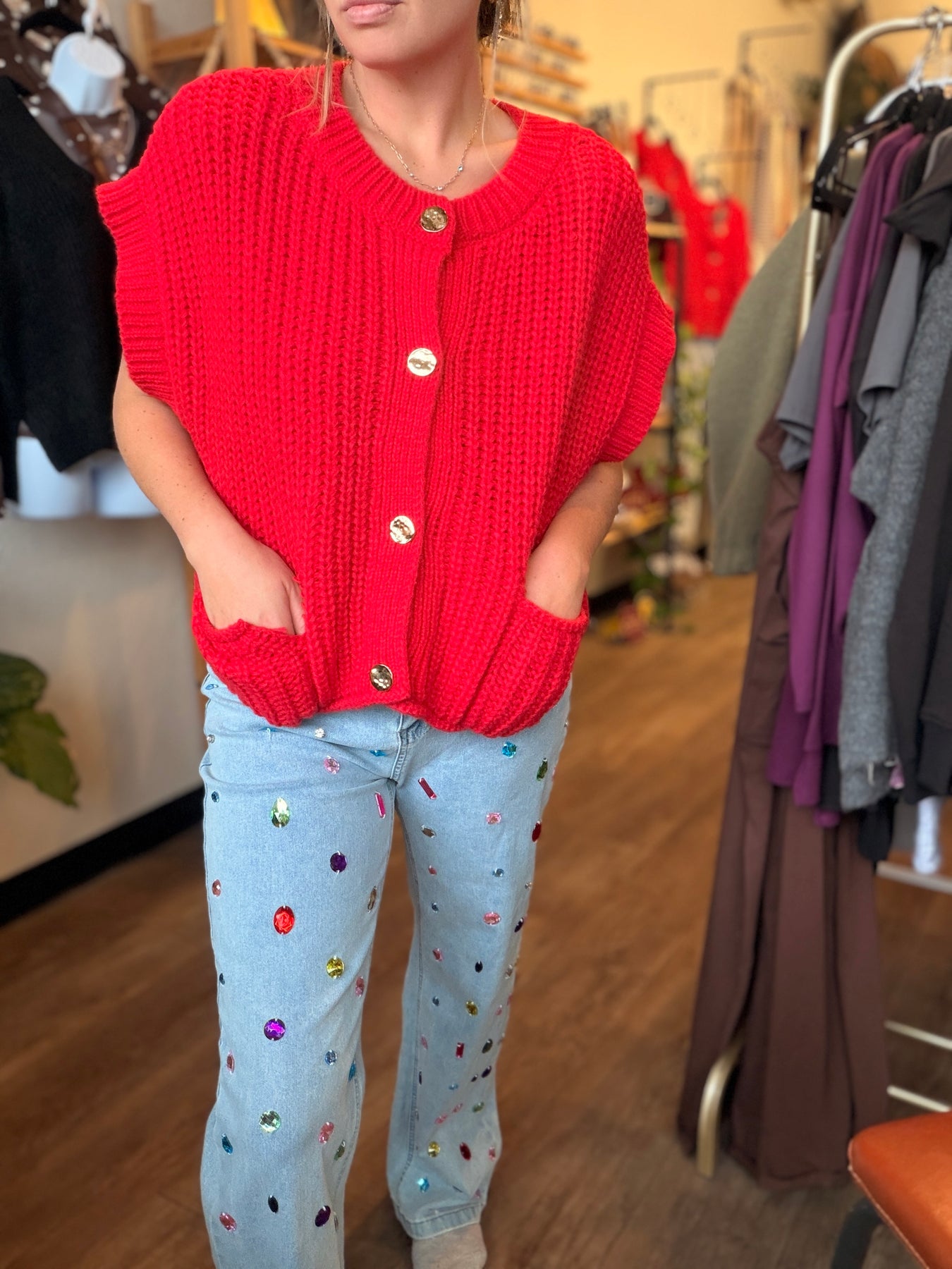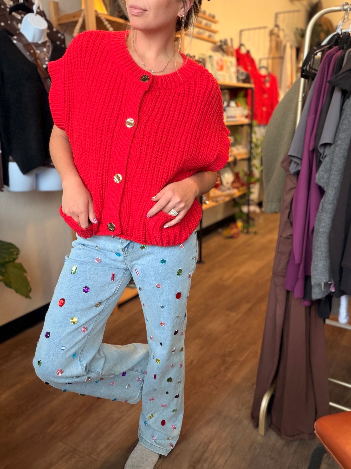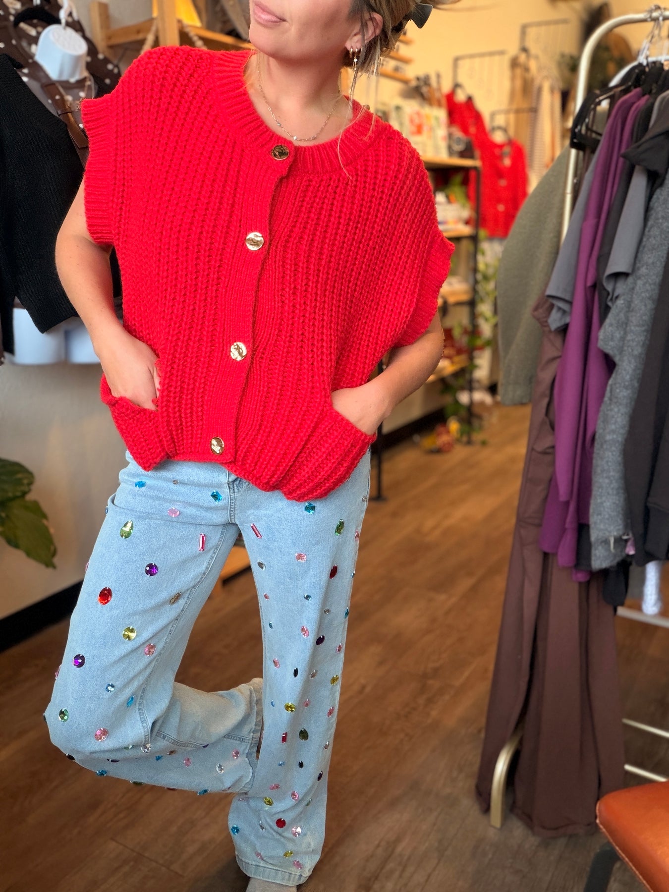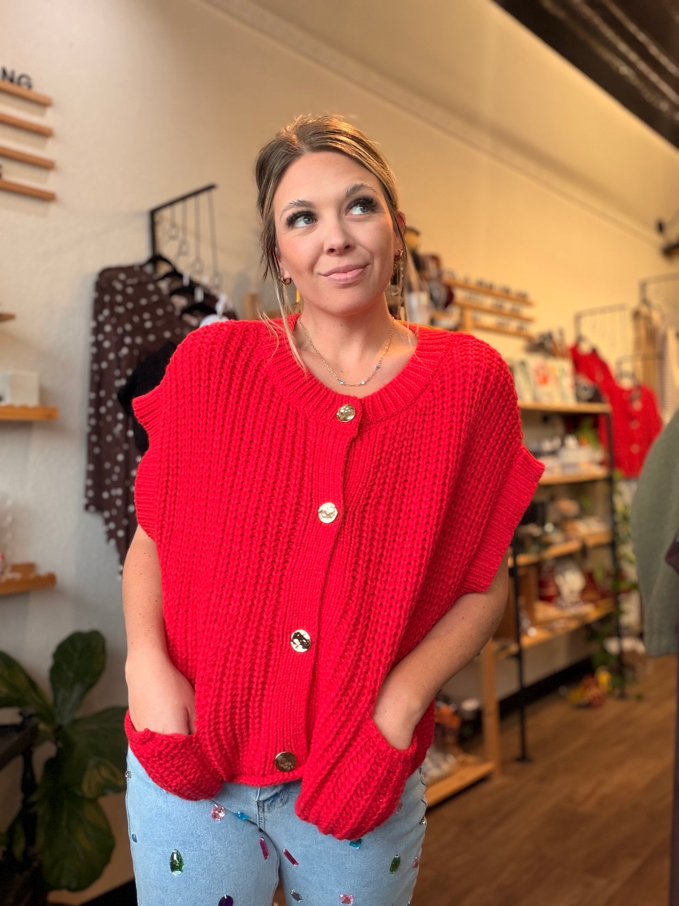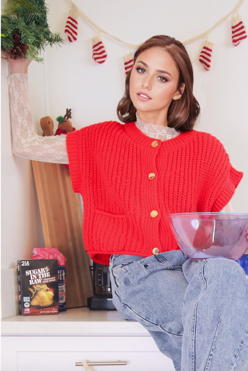 Wrap yourself in holiday warmth with the Full Of Spice Sweater Top—a knitted red beauty that's as cozy as it is charming. Featuring classic button details and a soft, comfortable fit, this festive piece is perfect for everything from casual gatherings to seasonal celebrations. The rich red hue and playful design make it an instant favorite for creating those picture-perfect holiday moments. Snuggle up in style this season!