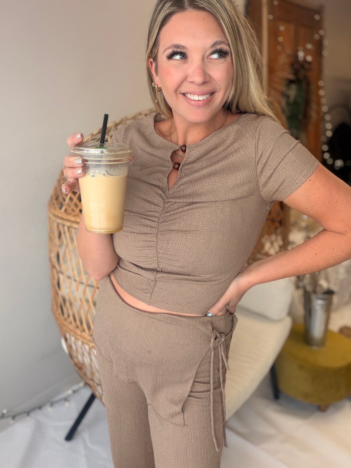 Elevate your everyday style with the Marina Pants, featuring a playful tied overwrap front that adds instant visual interest. Crafted from a soft texture knit blend of 98% polyester and 2% spandex, these pants deliver comfort and flexibility for all-day wear. The unique front detail creates a flattering silhouette while the stretchy fabric moves with you. Perfect for casual outings or relaxed weekend vibes, the Marina Pants are your new go-to for effortless style that doesn't compromise on comfort.