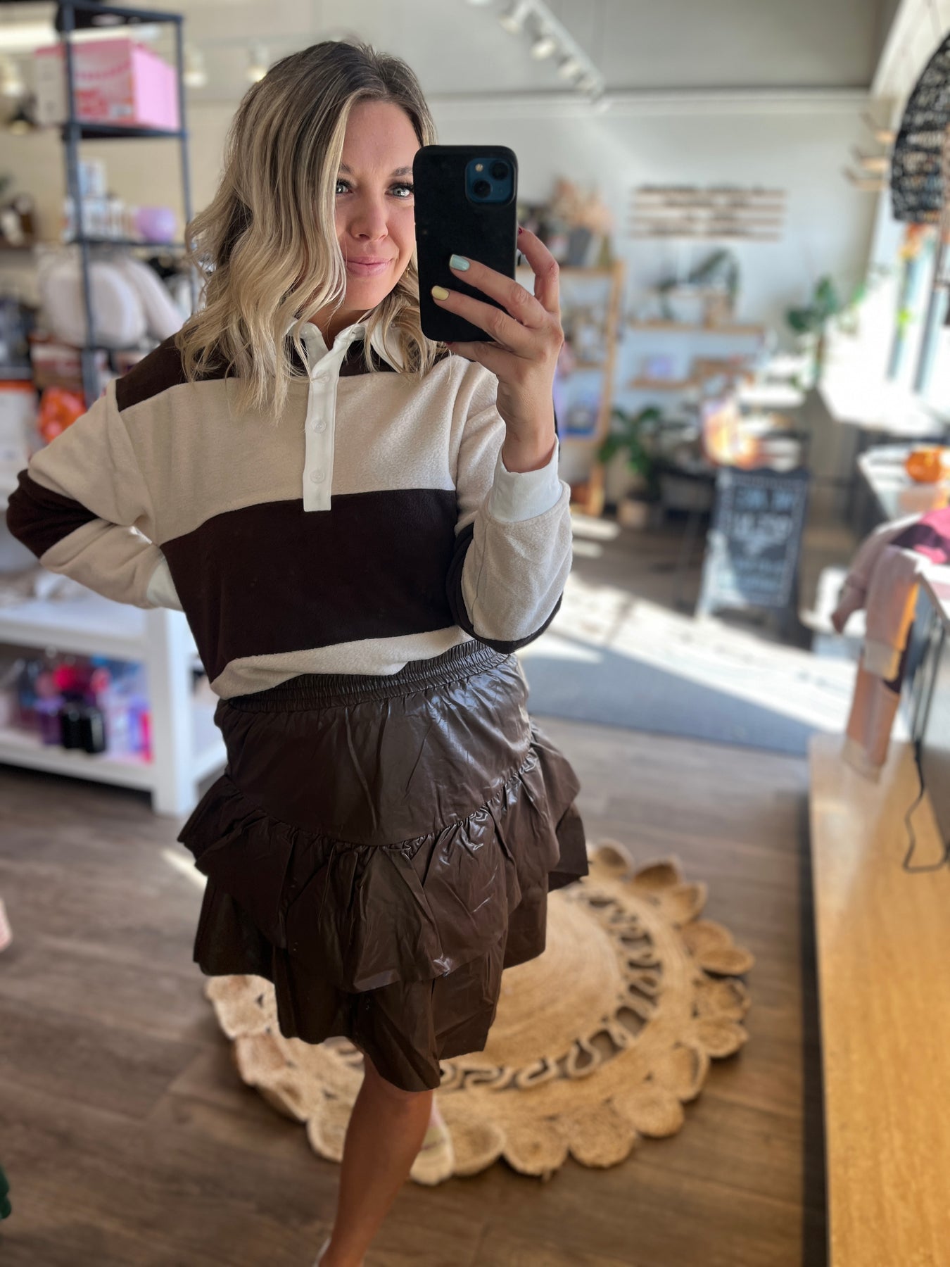 Add a flirty twist to your look with this Chocolate Ruffle Skirt. Crafted from faux leather with a soft lining for comfort, it features an elastic waist for an easy, flattering fit. The playful ruffles bring movement and charm to any outfit, making it a fun choice for day or night.