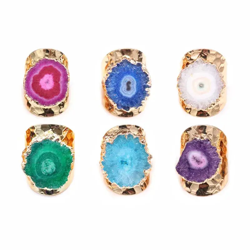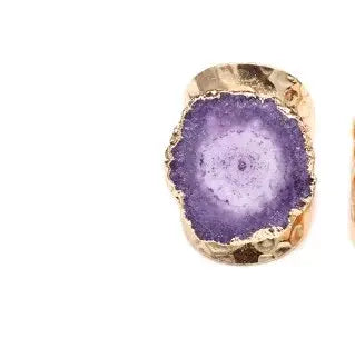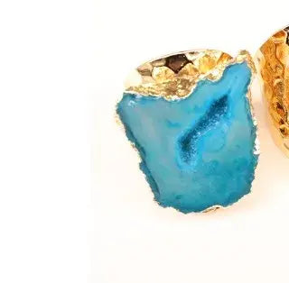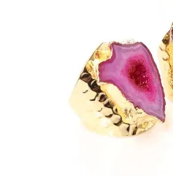 This crystal agate ring jewelry features a natural irregular stone set in gold plated stainless steel. Each ring is unique, making it a bold statement jewelry piece with organic shape and vibrant color.