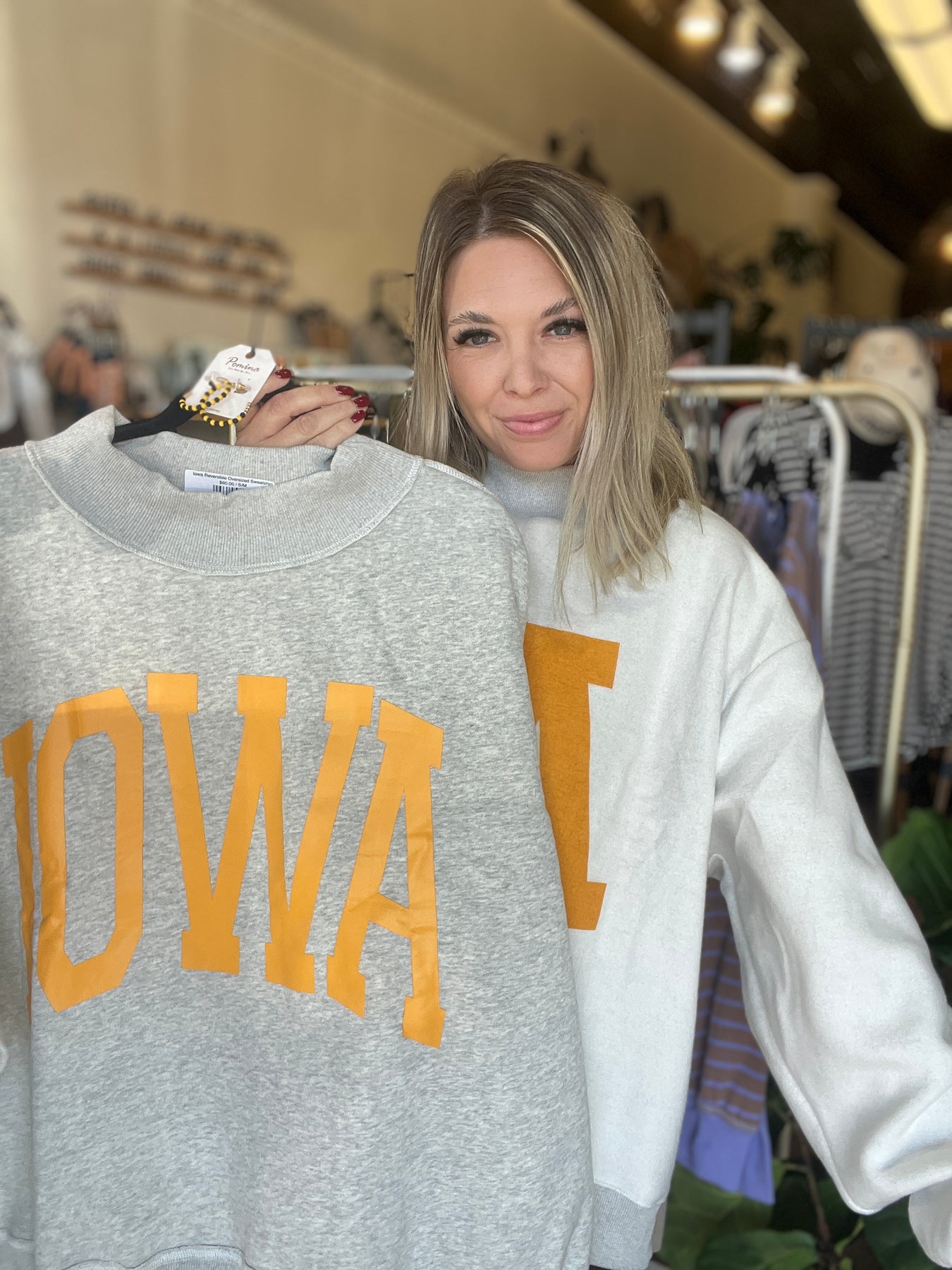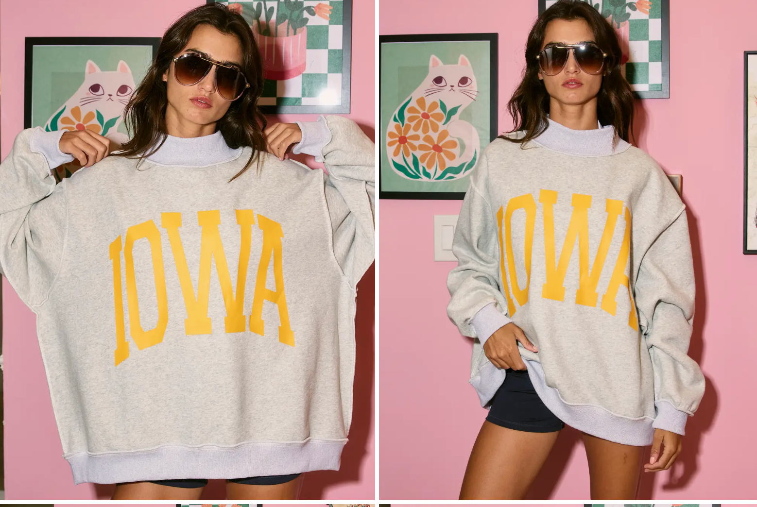 Stay cozy and stylish with this Iowa Reversible Oversized Sweatshirt. Featuring a trendy mock neck and drop shoulders, its soft fleece feels like a warm hug. The oversized fit and ribbed cuffs add comfort, while the reversible design lets you switch up your look anytime. Perfect for showing off your Iowa pride with a playful twist!