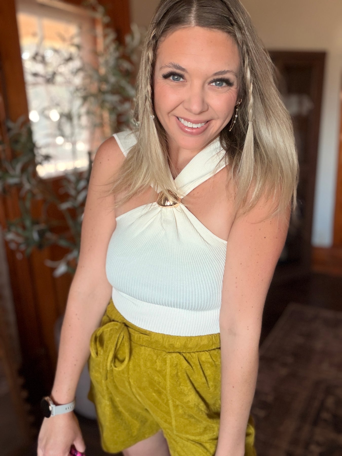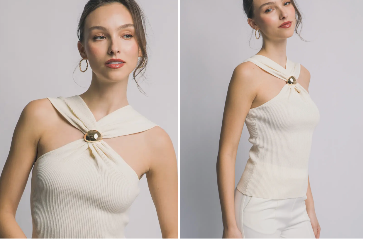 Elevate your wardrobe with this sophisticated halter sweater top featuring a flattering V neckline and sleeveless silhouette. The standout twist detail adorned with a gold orb adds an elegant touch of glamour to any outfit. Crafted from a luxurious blend of 70% viscose and 30% polyester, this piece offers a soft, fluid drape that moves beautifully with you. Perfect for dressing up or down, this versatile top pairs effortlessly with your favorite bottoms for a polished, refined look.