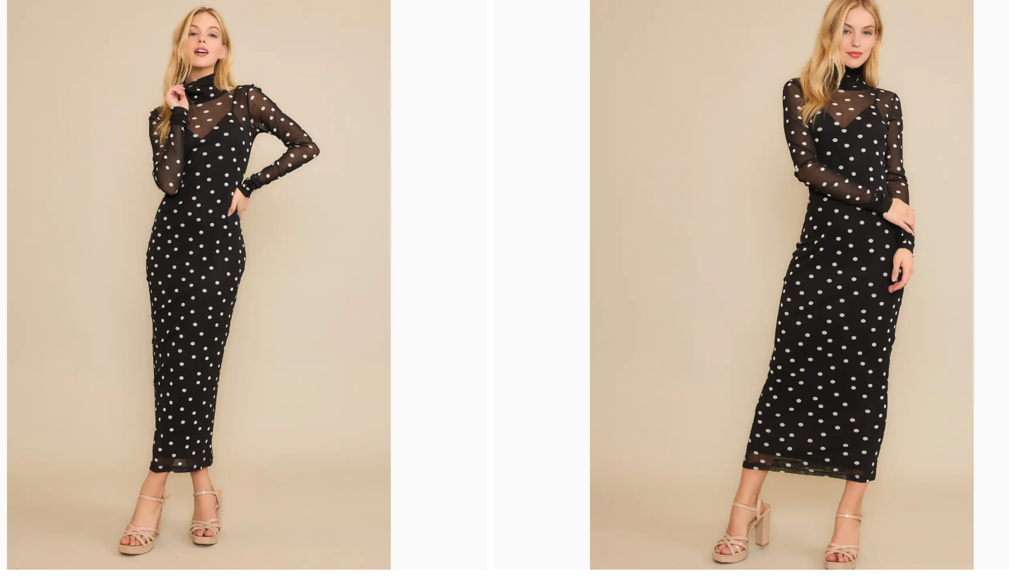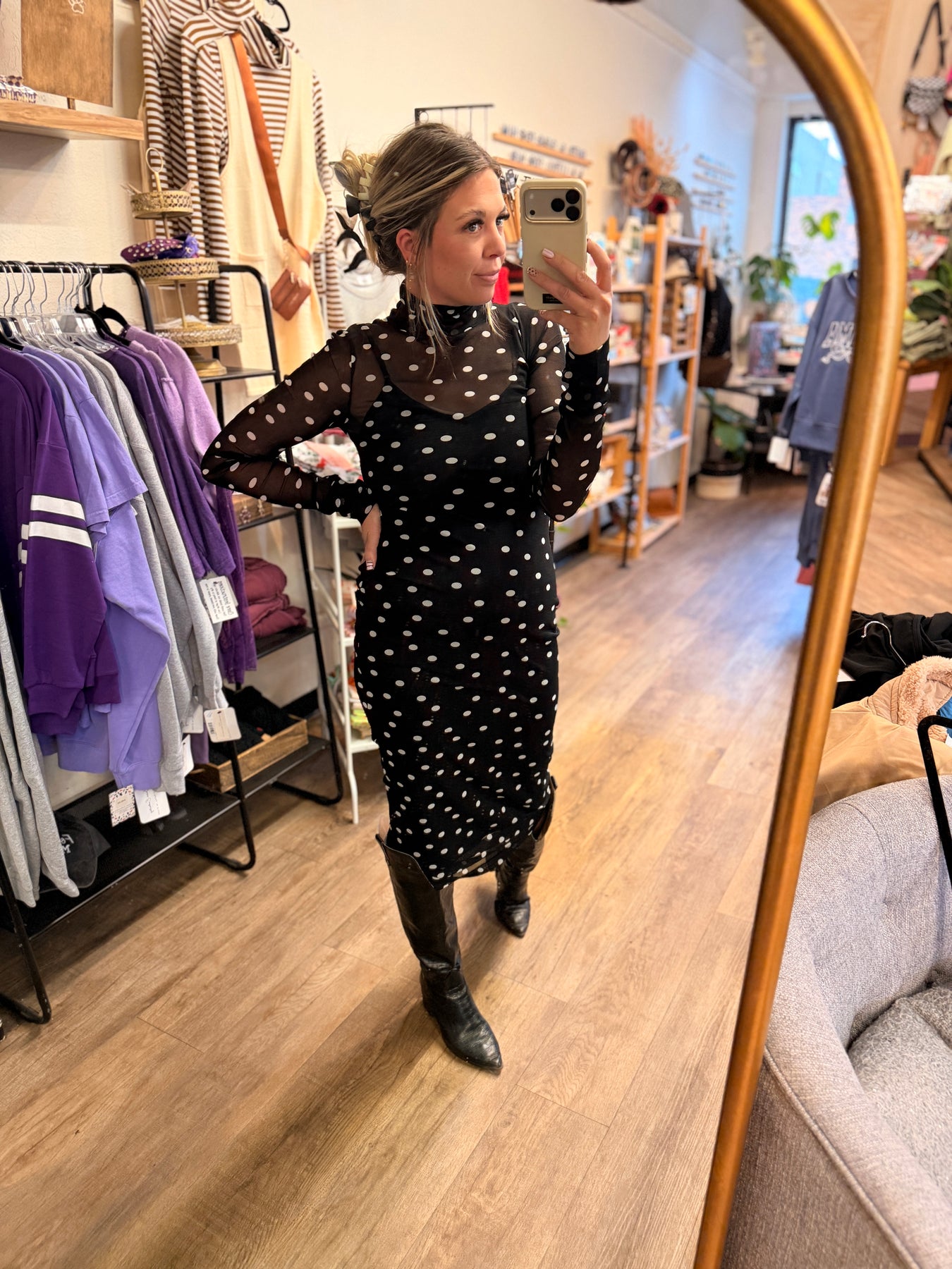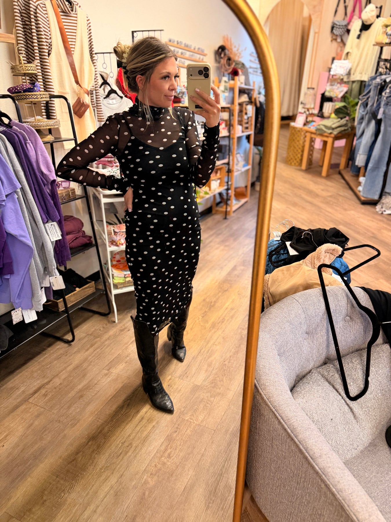 Slip into effortless elegance with the Sweet Dots Dress, a chic mesh maxi that hugs your curves in all the right ways. This fitted long-sleeve design features a sophisticated high neckline and comes with a separate tank lining for comfort and coverage. Perfect for turning heads at evening events or adding polish to your everyday rotation. Our model (5'10", size small) showcases how beautifully this dress drapes. Timeless style meets modern edge.