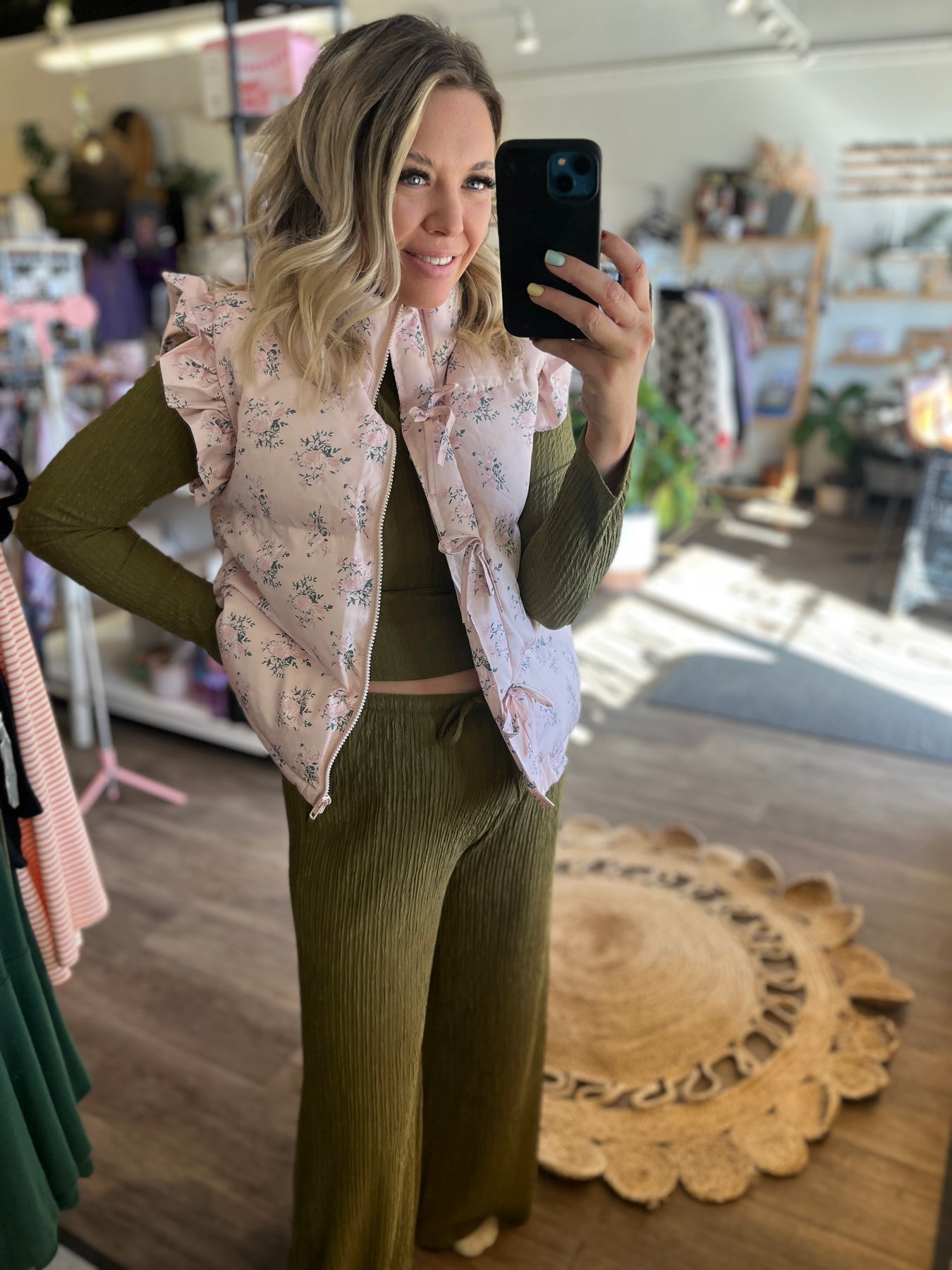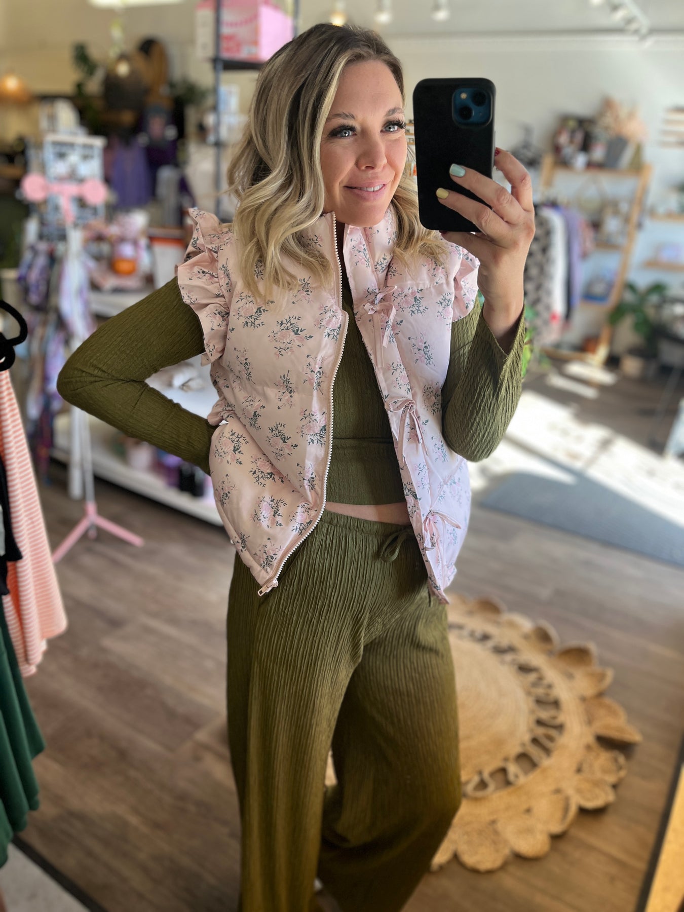Stay cozy and stylish with the Very Fall Vests, available in two charming floral and solid colors. Featuring playful front bow ruffle sleeves and a sleek mock neck, this puffer vest adds a fun twist to your fall wardrobe. The front zipper and handy side pockets keep things practical while you embrace the crisp air. Perfect for layering up with a splash of personality!