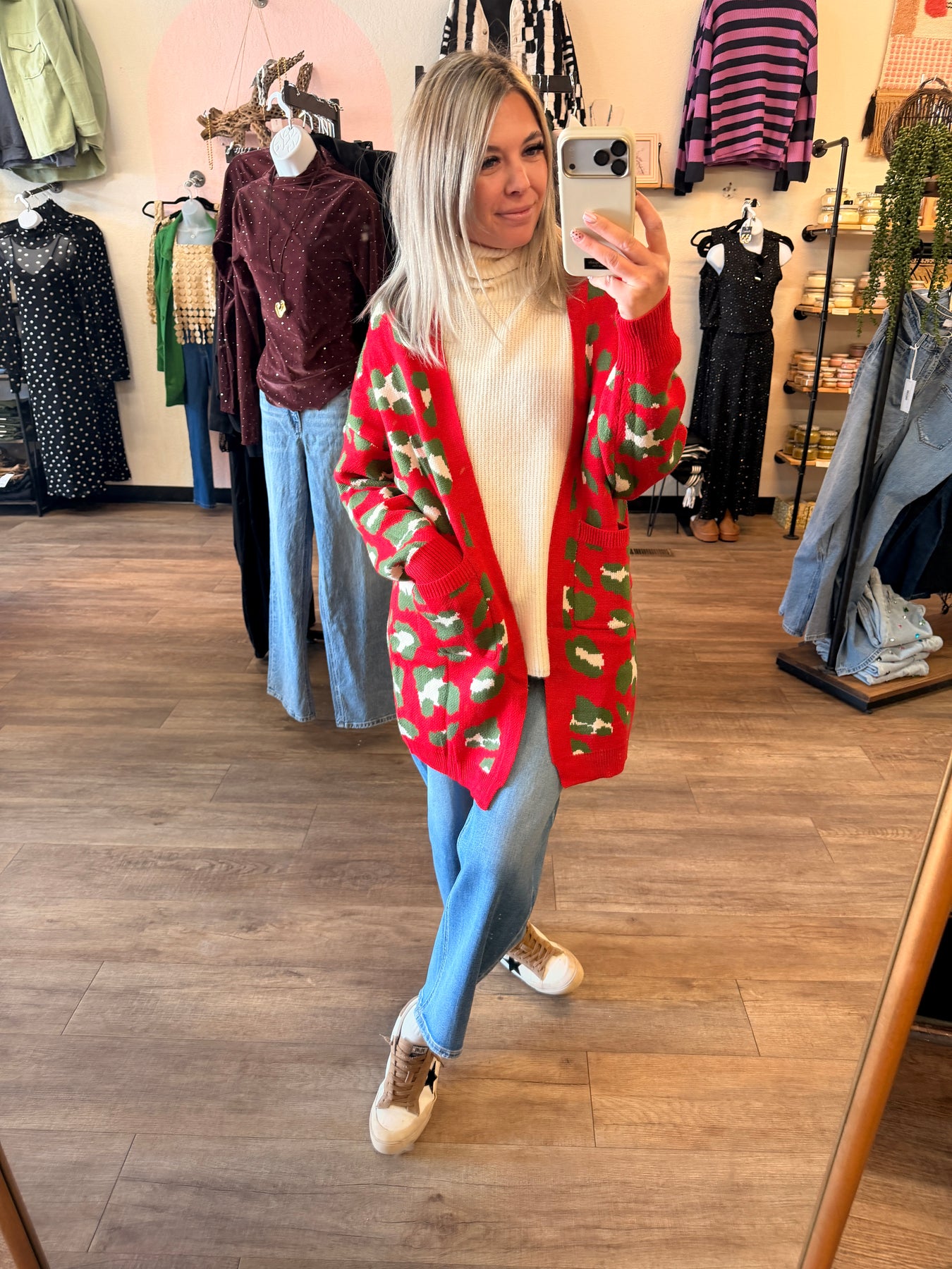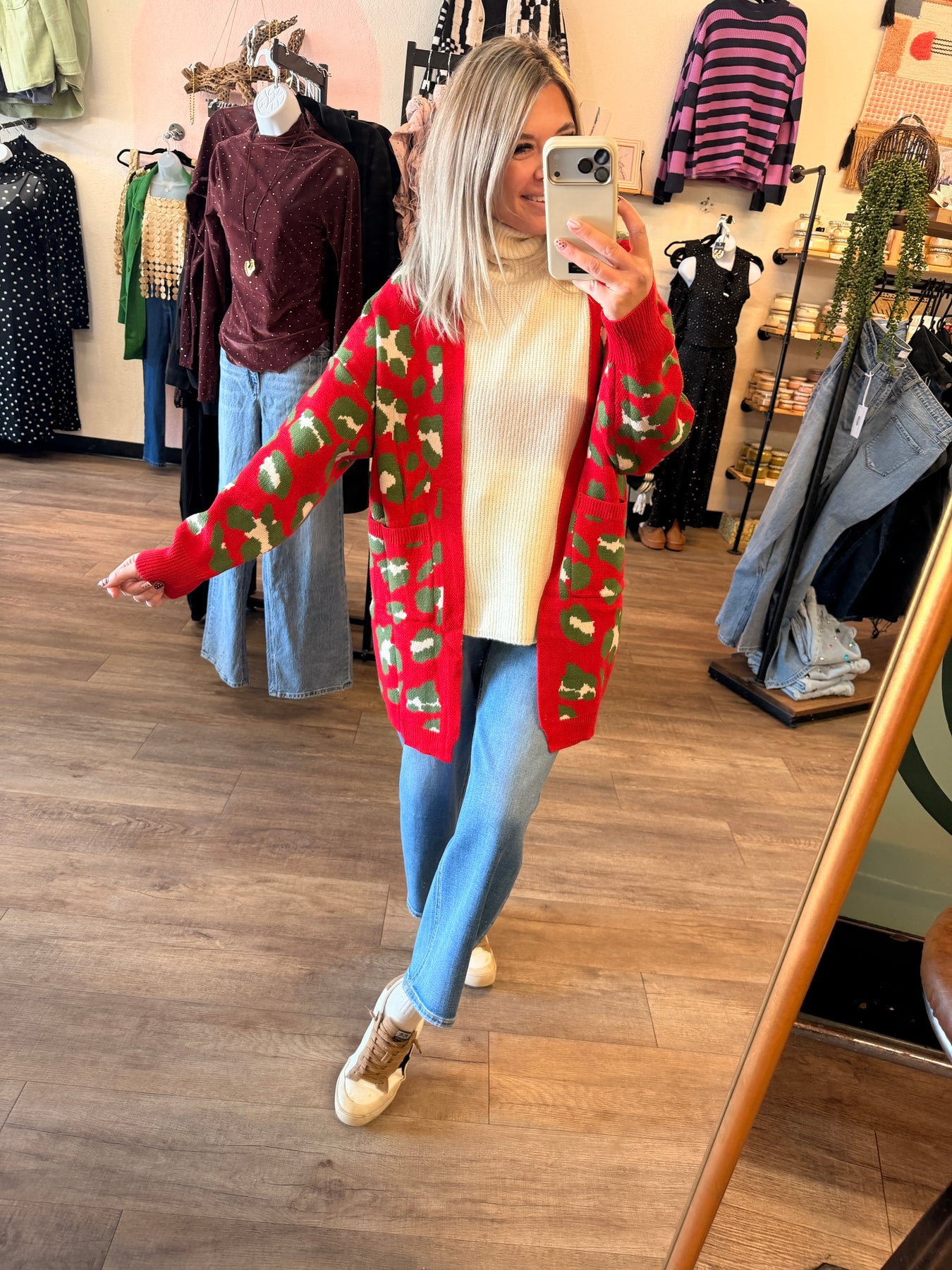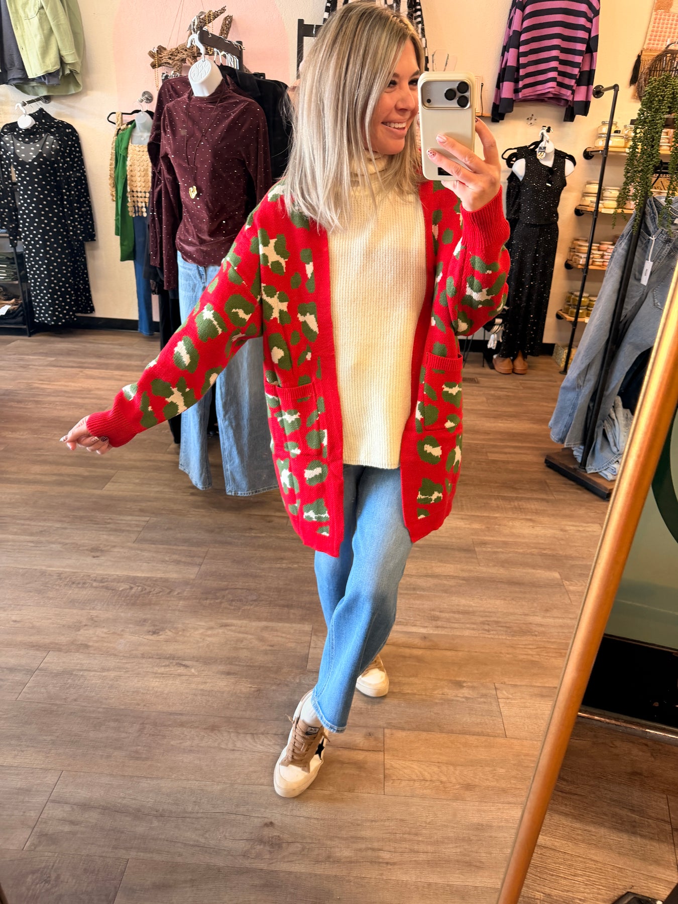 Embrace your wild side this season with our A Wild Holiday Cardigan—a playful take on festive fashion. This oversized beauty combines classic holiday colors with a bold leopard print, delivering the perfect blend of cozy comfort and statement-making style. Whether you're layering over your favorite holiday outfit or throwing it on for casual gatherings, this cardigan brings fun, personality, and warmth to your seasonal wardrobe. It's the kind of piece that makes people smile.
