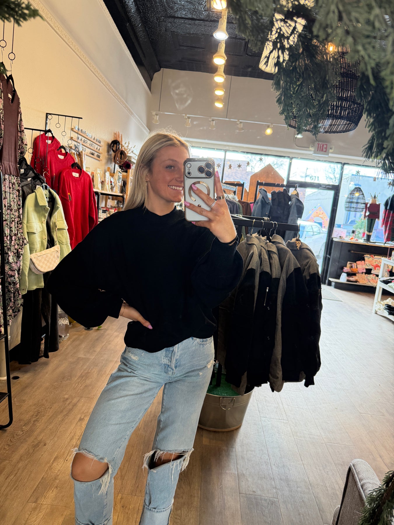 Effortless style meets cozy comfort with this black balloon sleeve sweater. The voluminous sleeves add a playful touch to an otherwise timeless basic, making it the perfect layering piece under your favorite vest. Soft and versatile, it's the wardrobe staple that works as hard as you do—whether you're keeping it simple or building the perfect outfit.
