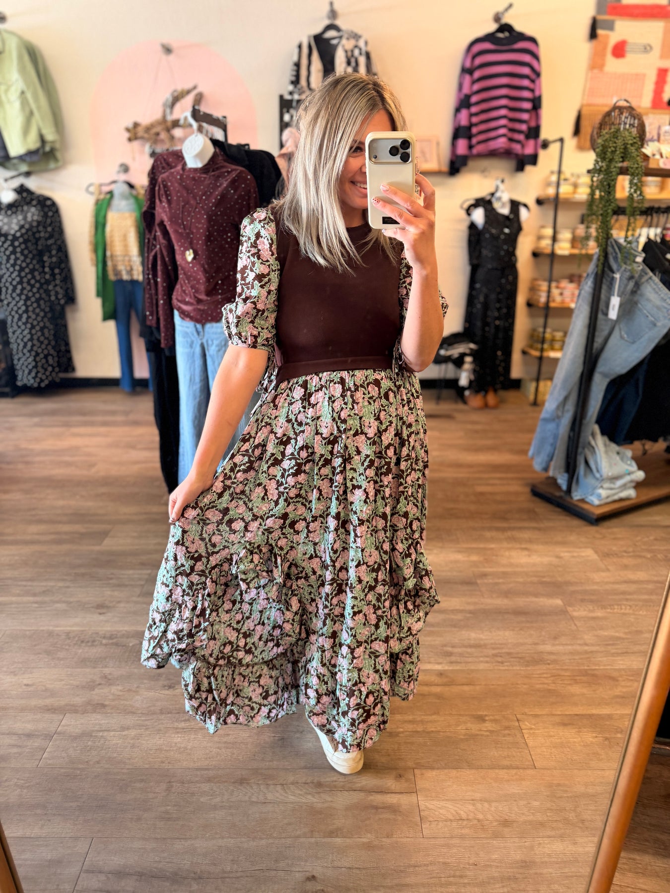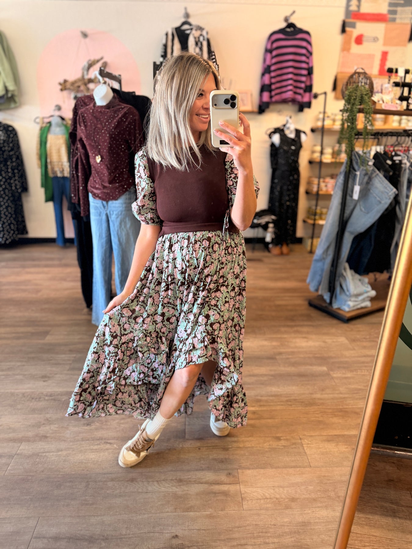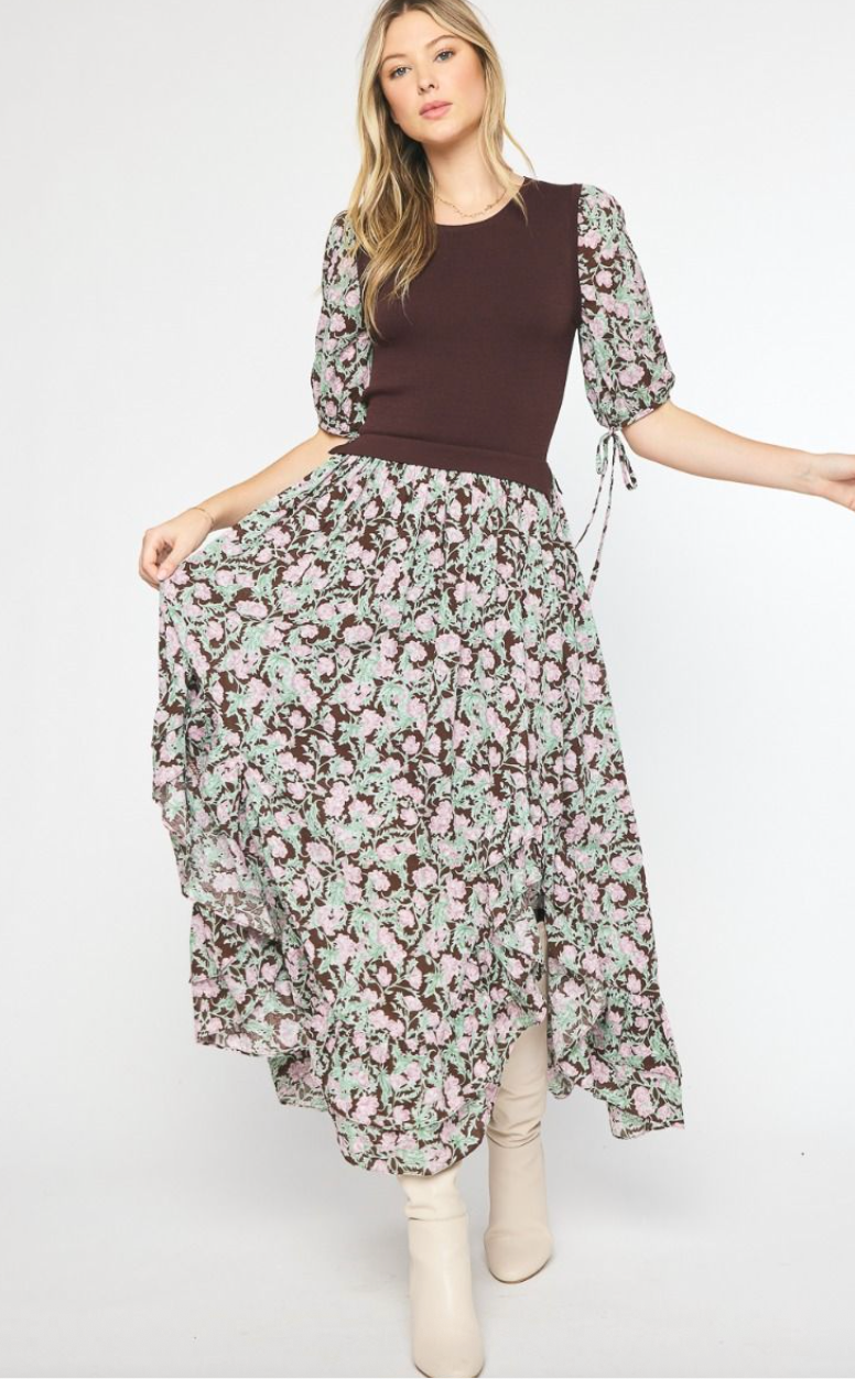 Twirl into spring with the Macen Dress, a floral-printed maxi that's equal parts romantic and refreshing. The contrasting knit bodice provides structure while adjustable tie sleeves let you customize your look—cinch them tight or let them flow. A playful ruffle hem adds movement with every step. Crafted from a lightweight viscose-nylon blend, this fully lined dress keeps you cool and comfortable without any see-through surprises. Perfect for garden parties, weekend getaways, or whenever you want to feel effortlessly put-together.