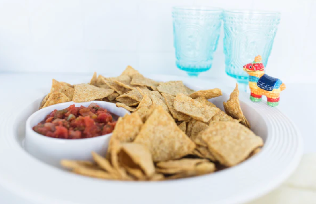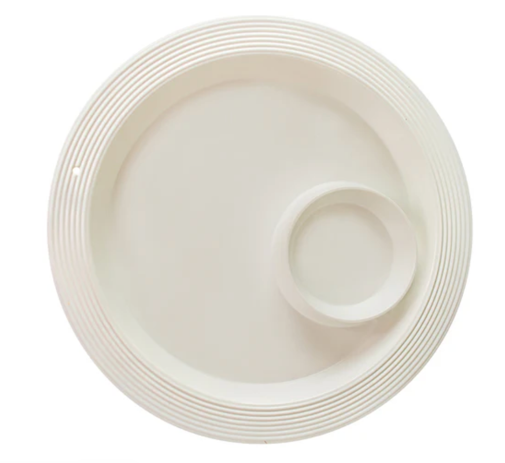 our a-nora-ble chip and dip platter is made of high-quality melamine, making it durable and convenient for outdoor use. its functional design makes it easy for small dip containers to fit perfectly into the platter, mess-free!
