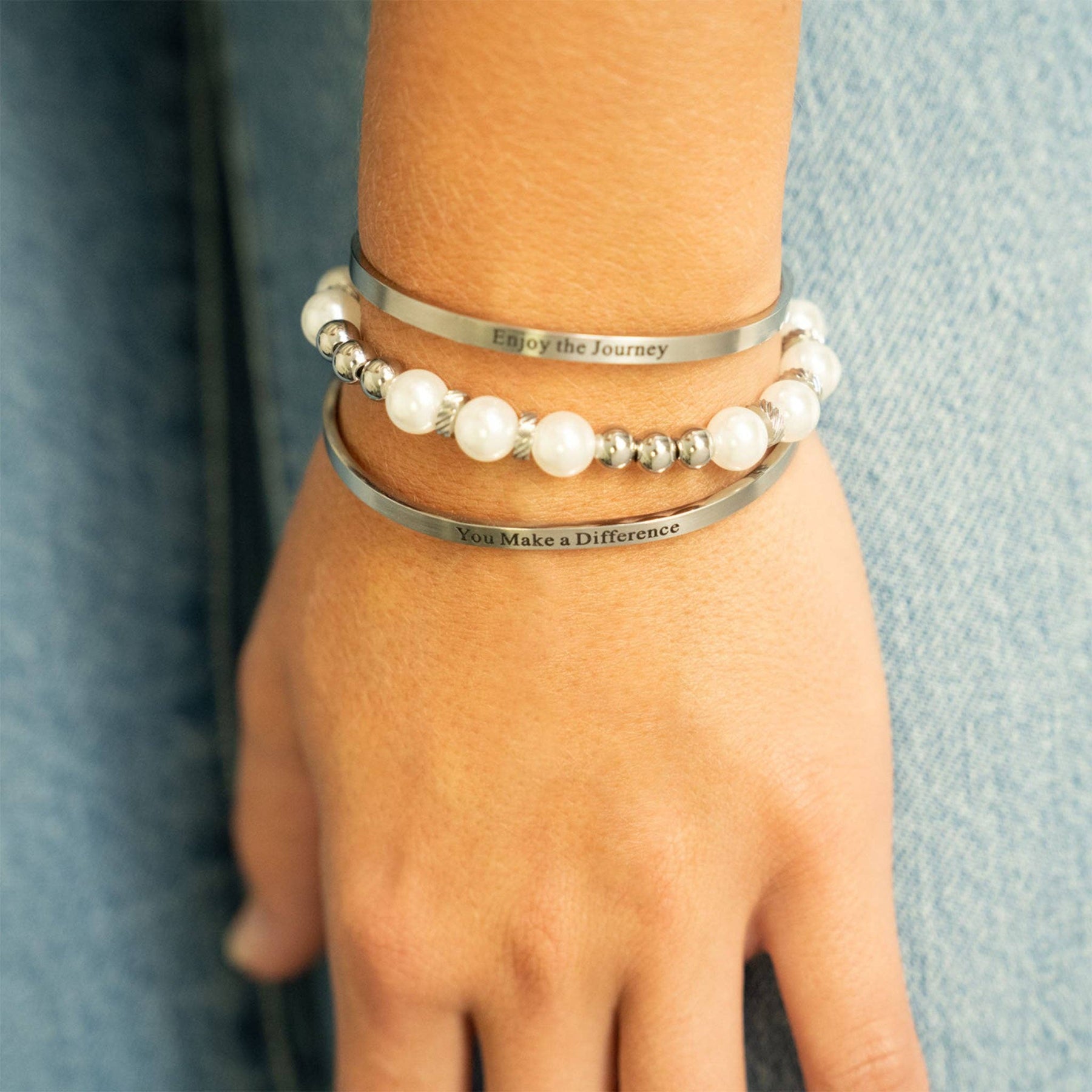 Wear a daily dose of inspiration with this 18K Gold PVD stainless steel cuff bracelet, engraved with "You Make a Difference." Its minimalist design transitions seamlessly from everyday moments to layered looks, while the hypoallergenic 316L surgical-grade steel ensures comfort for all skin types. Completely waterproof and tarnish-resistant, this bracelet delivers both meaningful encouragement and lasting durability. Dimensions: 2.5" x 2", 3.5mm width.